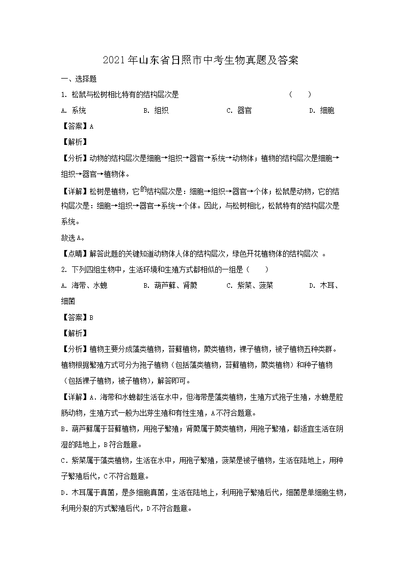 【文档名称】 2021年山东省日照市中考生物真题及答案(Word版).doc