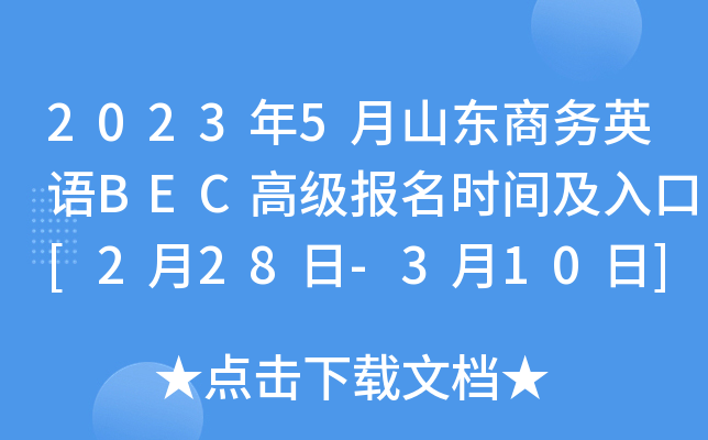 【#商务英语考试(BEC)# #2023年5月山东商务英语BEC高级报名时间及入口[2月28日-3月10日]#】©无忧考网从中国教育考试网发布的《2023年5月剑桥商务英语考试BEC相关安排的通知》得知,2023年5月山东商务英语BEC高级报名时间及入口已公布,2月28日-3月10日进行报名,具体详情如下: