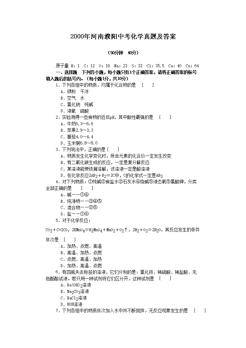 【文档名称】 2000年河南濮阳中考化学真题及答案(Word版).doc