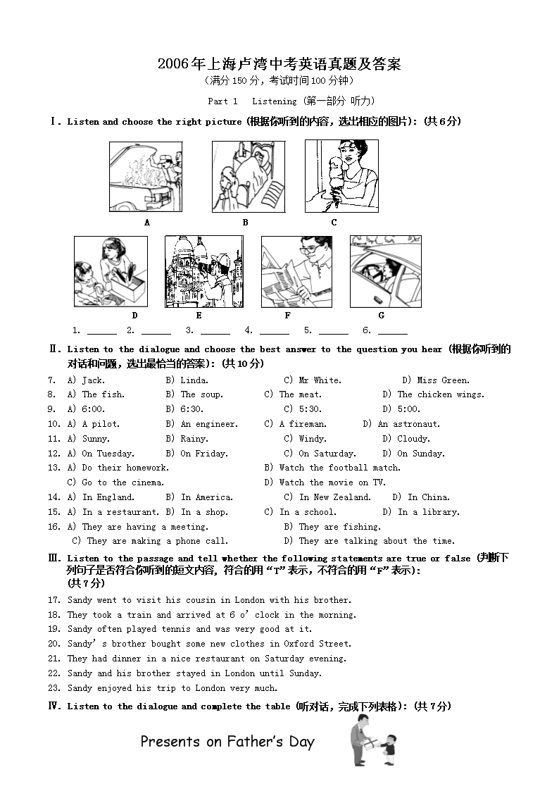 【文档预览】 无忧考网整理发布2006年上海卢湾中考英语真题及答案(Word版),前五页预览如下: