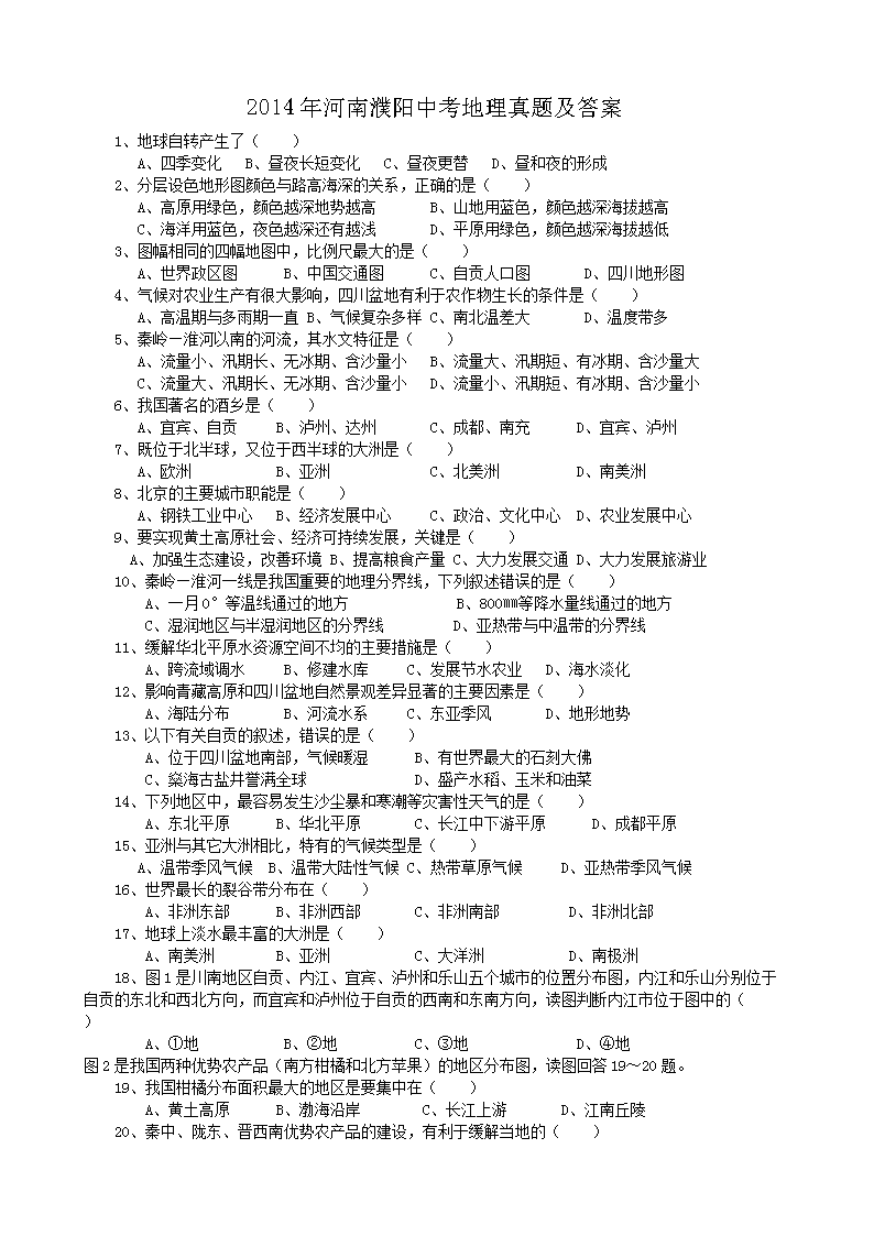 【文档名称】 2014年河南濮阳中考地理真题及答案(Word版).doc