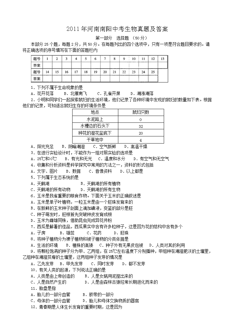 【文档预览】 无忧考网整理发布2011年河南南阳中考生物真题及答案(Word版),前五页预览如下: