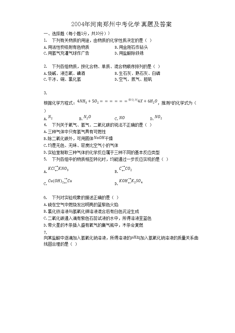 【文档名称】 2004年河南郑州中考化学真题及答案(Word版).doc