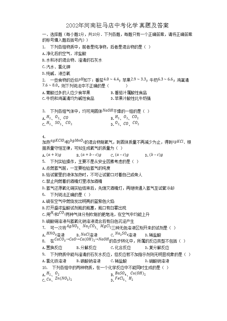【文档预览】 无忧考网整理发布2002年河南驻马店中考化学真题及答案(Word版),前五页预览如下:
