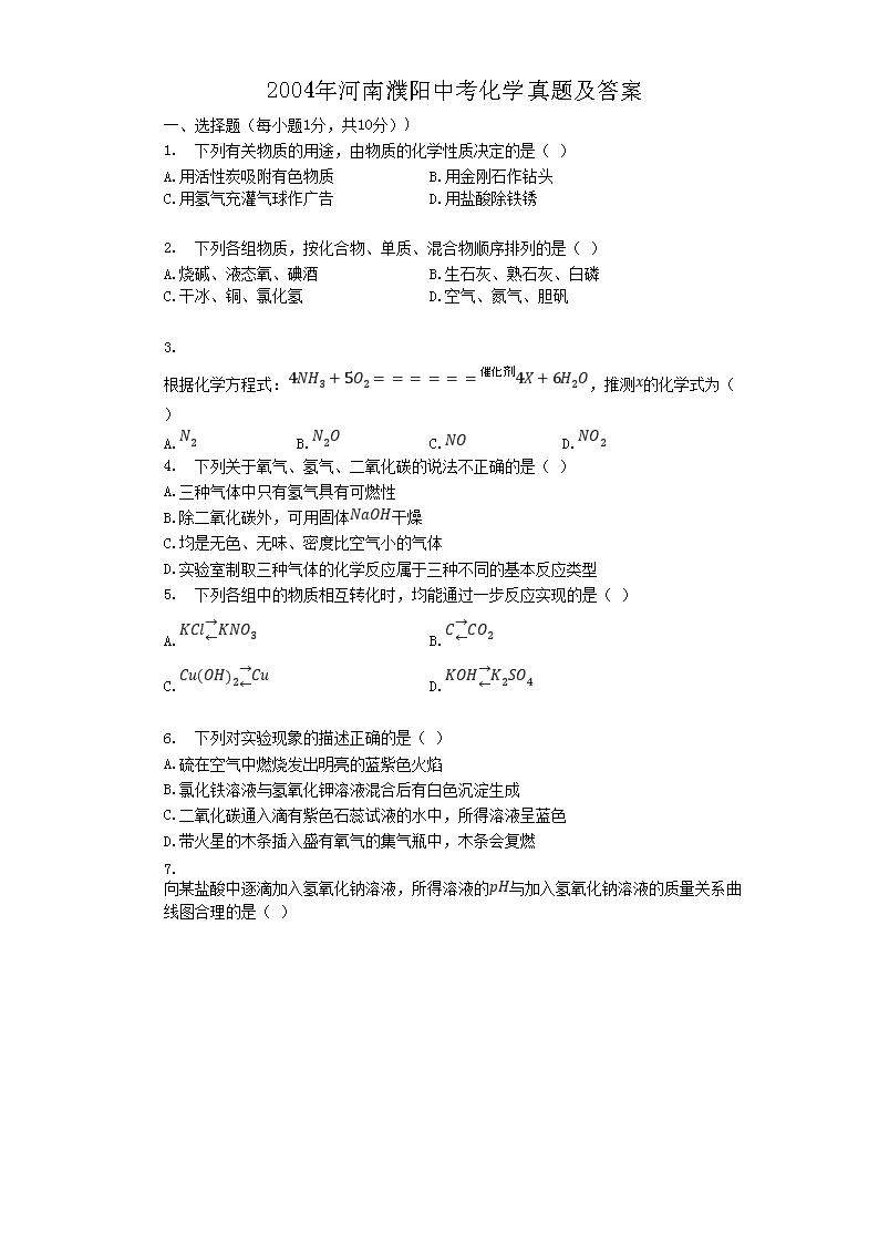 【文档名称】 2004年河南濮阳中考化学真题及答案(Word版).doc