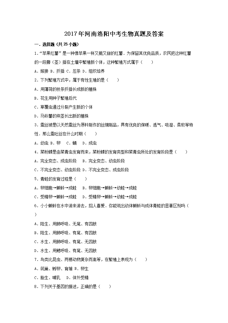 【文档名称】 2017年河南洛阳中考生物真题及答案(Word版).doc