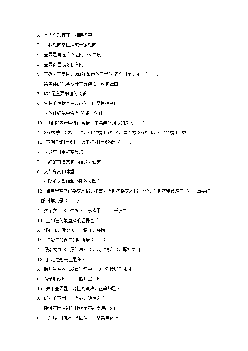 【文档名称】 2017年河南驻马店中考生物真题及答案(Word版).doc