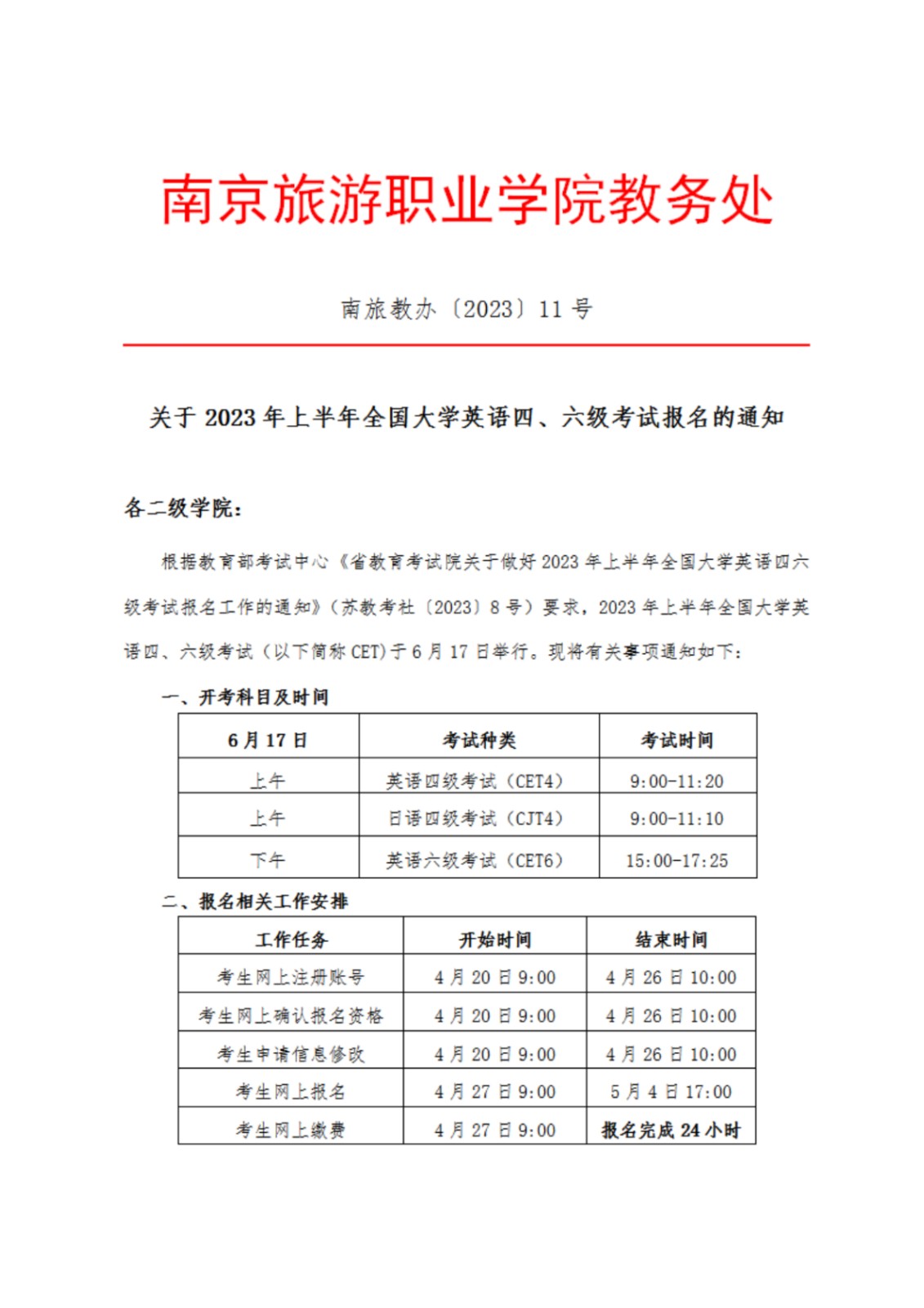 【#大学英语四六级考试# #2023年上半年江苏南京旅游职业学院英语四、六级考试报名通知[报名时间4月27日起]#】®无忧考网从南京旅游职业学院获悉,2023年上半年江苏南京旅游职业学院英语四、六级考试报名通知已公布,报名时间4月27日起,具体详情如下: