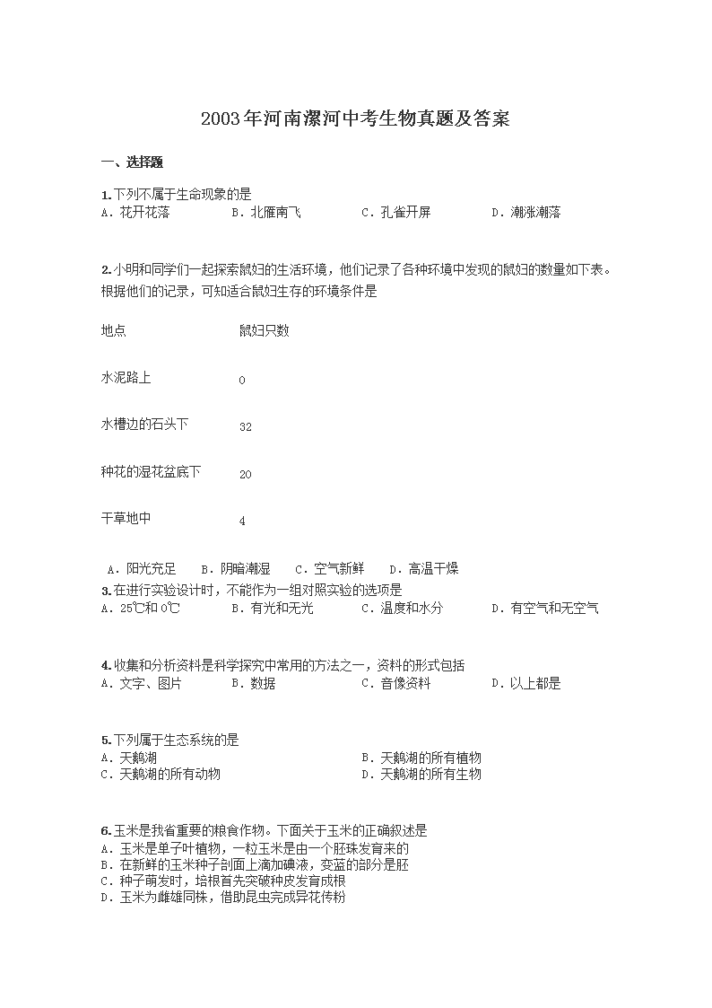 【文档预览】 无忧考网整理发布2003年河南漯河中考生物真题及答案(Word版),前五页预览如下: