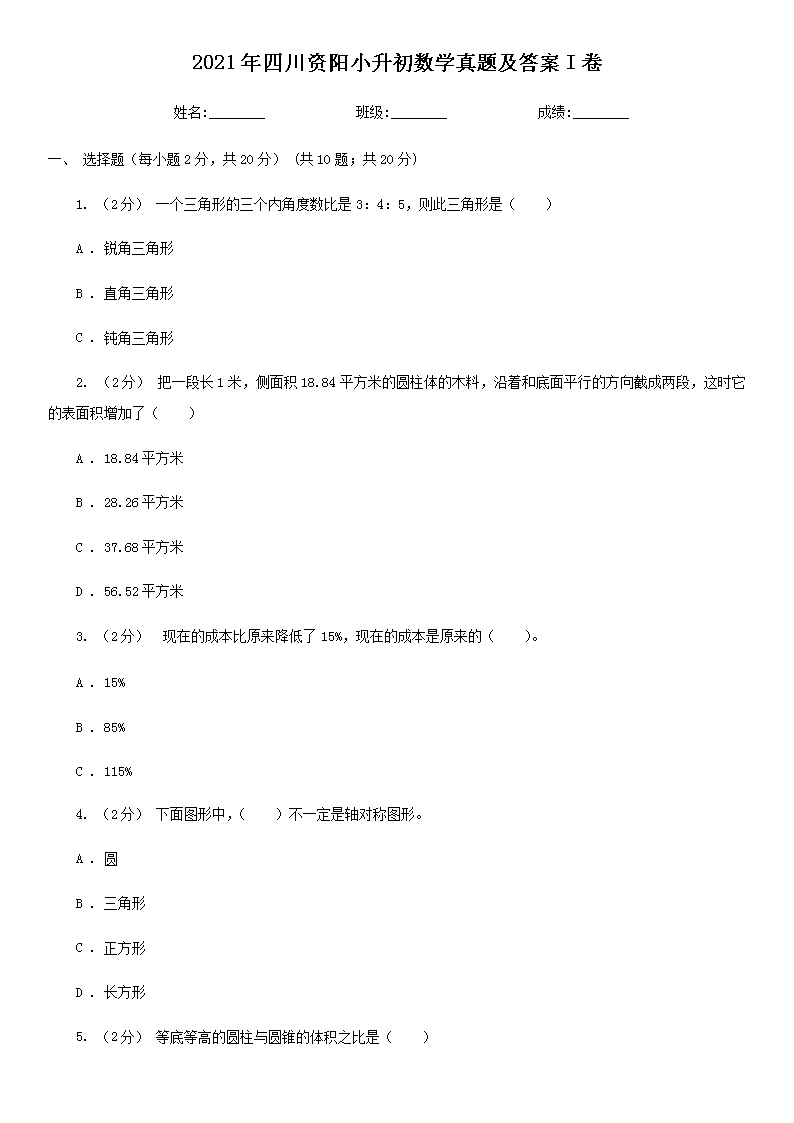 【文档名称】 2021年四川资阳小升初数学真题及答案I卷(Word版).doc