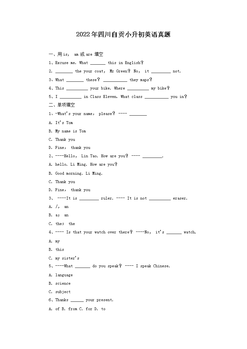 【文档预览】 无忧考网整理发布2022年四川自贡小升初英语真题(Word版),前五页预览如下: