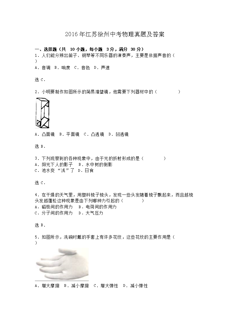 【文档预览】 无忧考网整理发布2016年江苏徐州中考物理真题及答案(Word版),前五页预览如下: