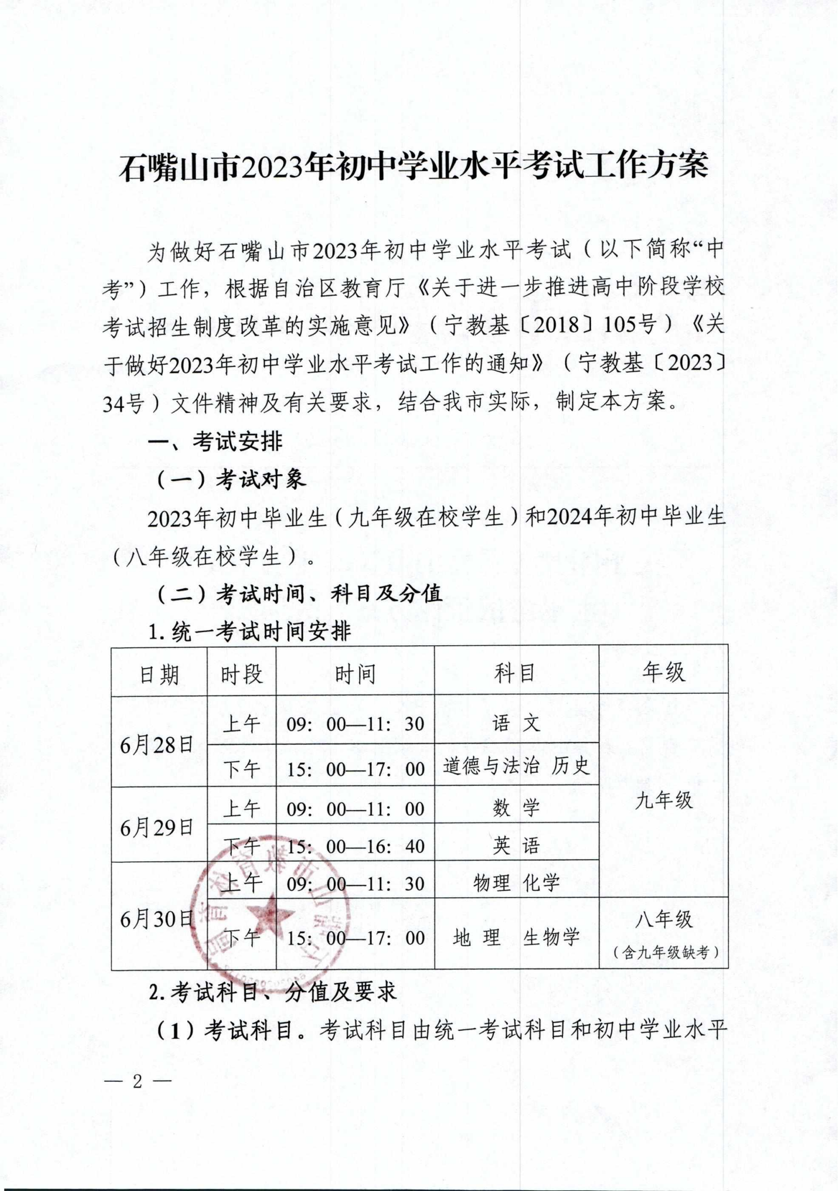 原文标题:关于印发《石嘴山市2023年初中学业水平考试工作方案》的通知