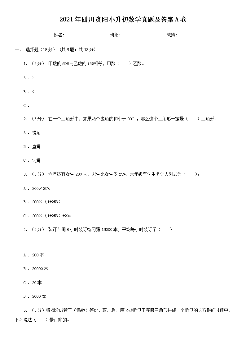 【文档预览】 无忧考网整理发布2021年四川资阳小升初数学真题及答案A卷(Word版),前五页预览如下: