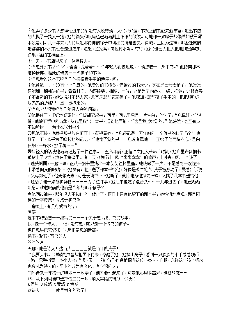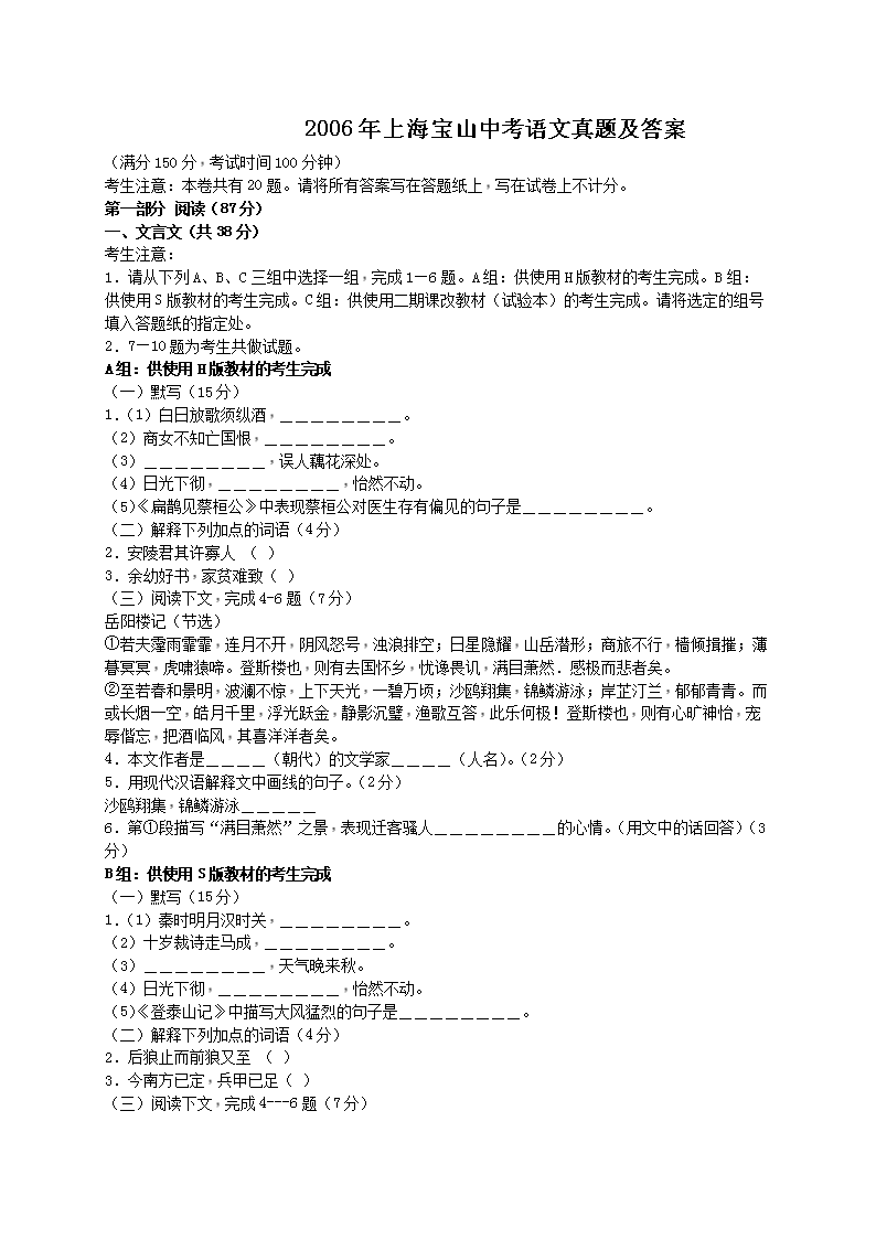 【文档预览】 无忧考网整理发布2006年上海宝山中考语文真题及答案(Word版),前五页预览如下: