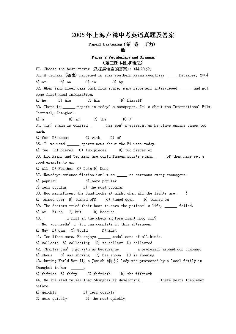 【文档名称】 2005年上海卢湾中考英语真题及答案(Word版).doc