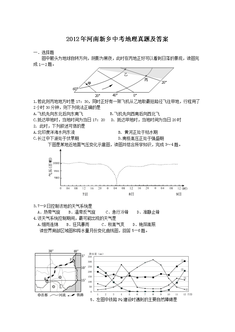【文档名称】 2012年河南新乡中考地理真题及答案(Word版).doc