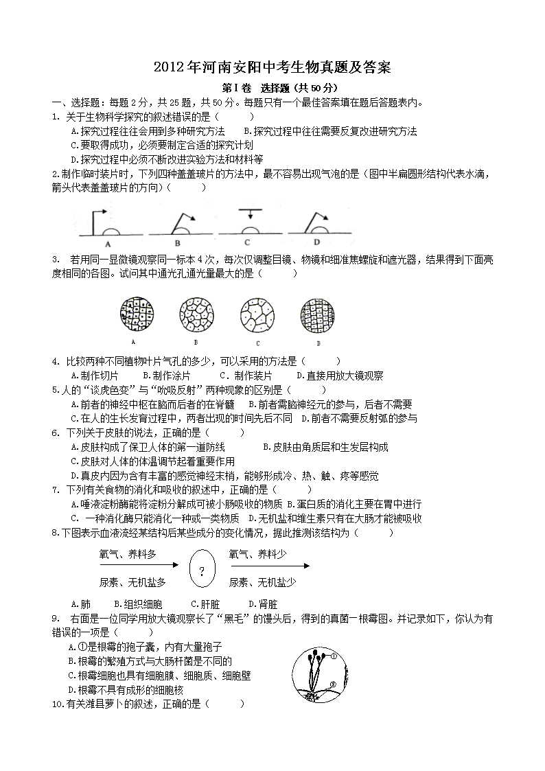 【文档名称】 2012年河南安阳中考生物真题及答案(Word版).doc