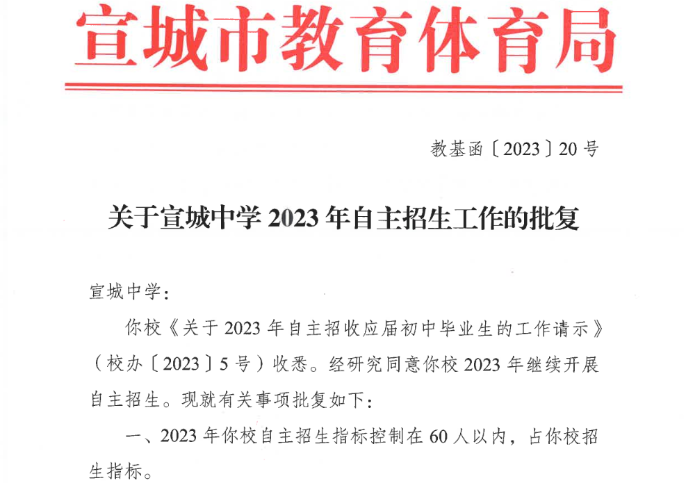 原文标题:0530教基函〔2023〕20号关于宣城中学2023年自主招生工作的批复