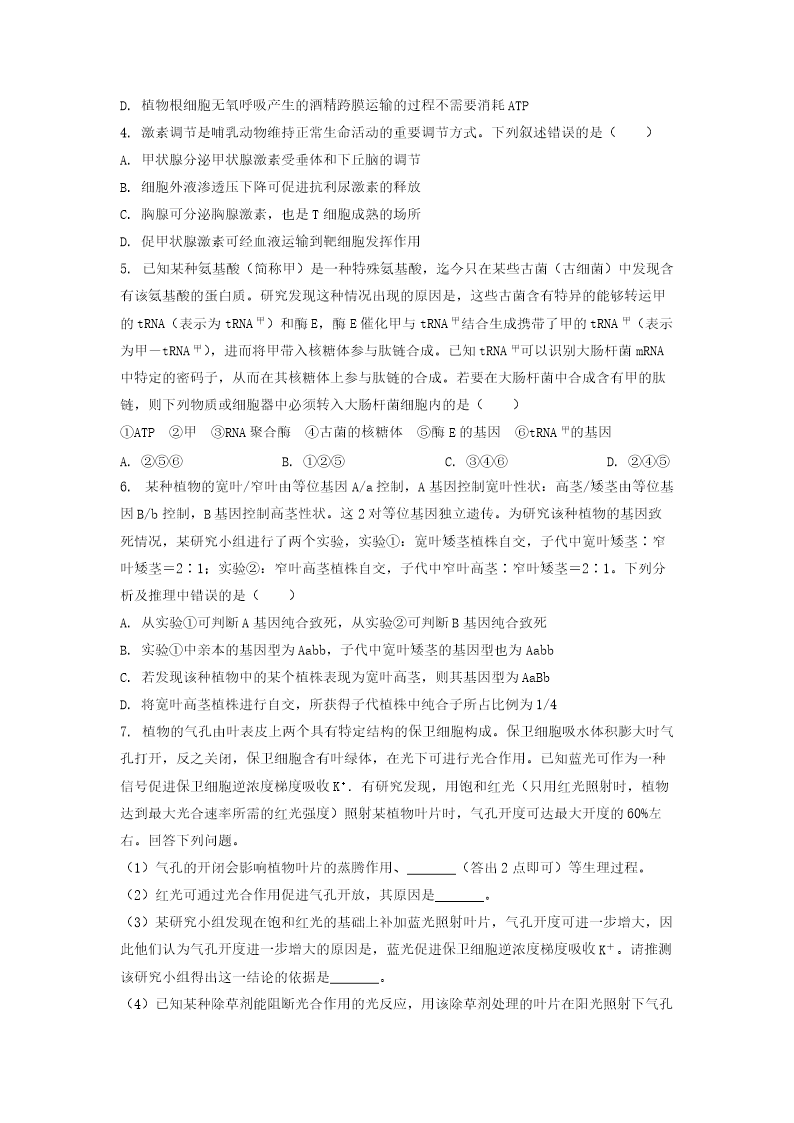 【文档名称】 2023年甘肃高考生物真题及答案(Word版).doc