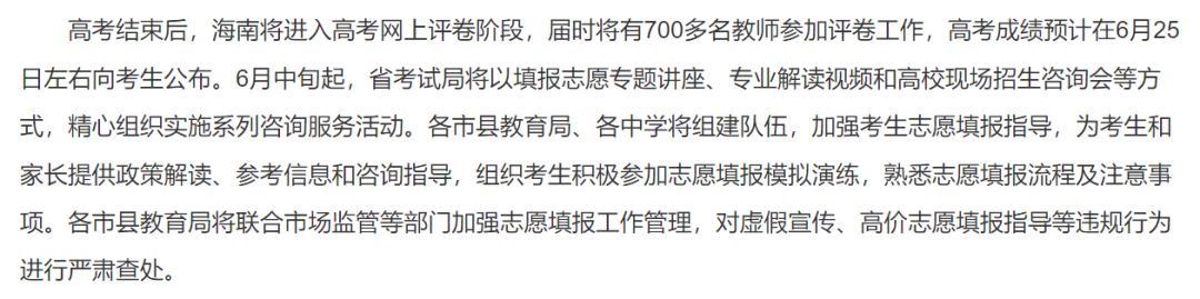 海南:高考成绩预计在6月25日左右向考生公布。