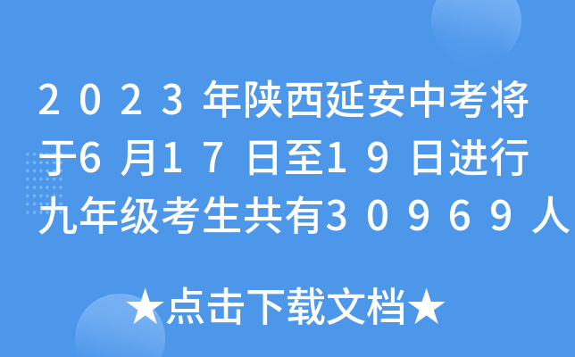 【#中考# #2023年陕西延安中考将于6月17日至19日进行 九年级考生共有30969人#】®无忧考网从延安市教育局了解到,2023年陕西延安中考将于6月17日至19日进行,八年级考生共有32611人,九年级考生共有30969人,详细内容如下: