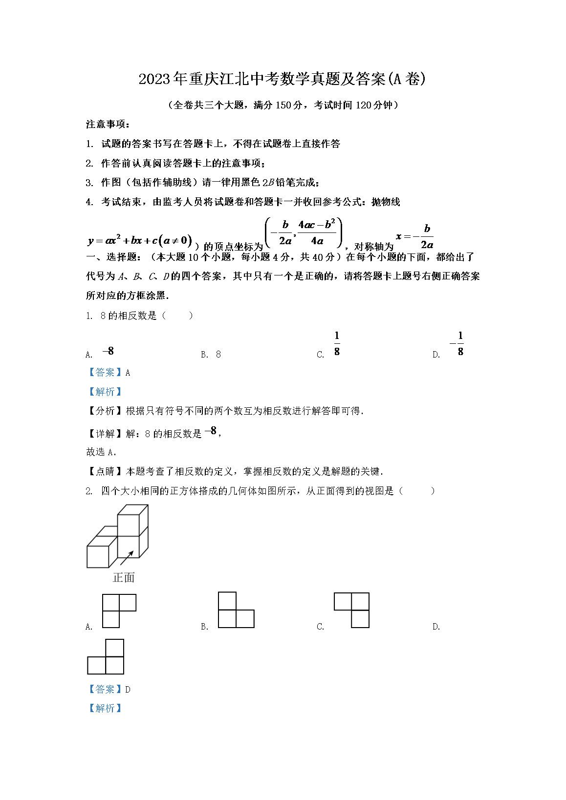 【文档名称】 2023年重庆江北中考数学真题及答案(A卷)(Word版).doc