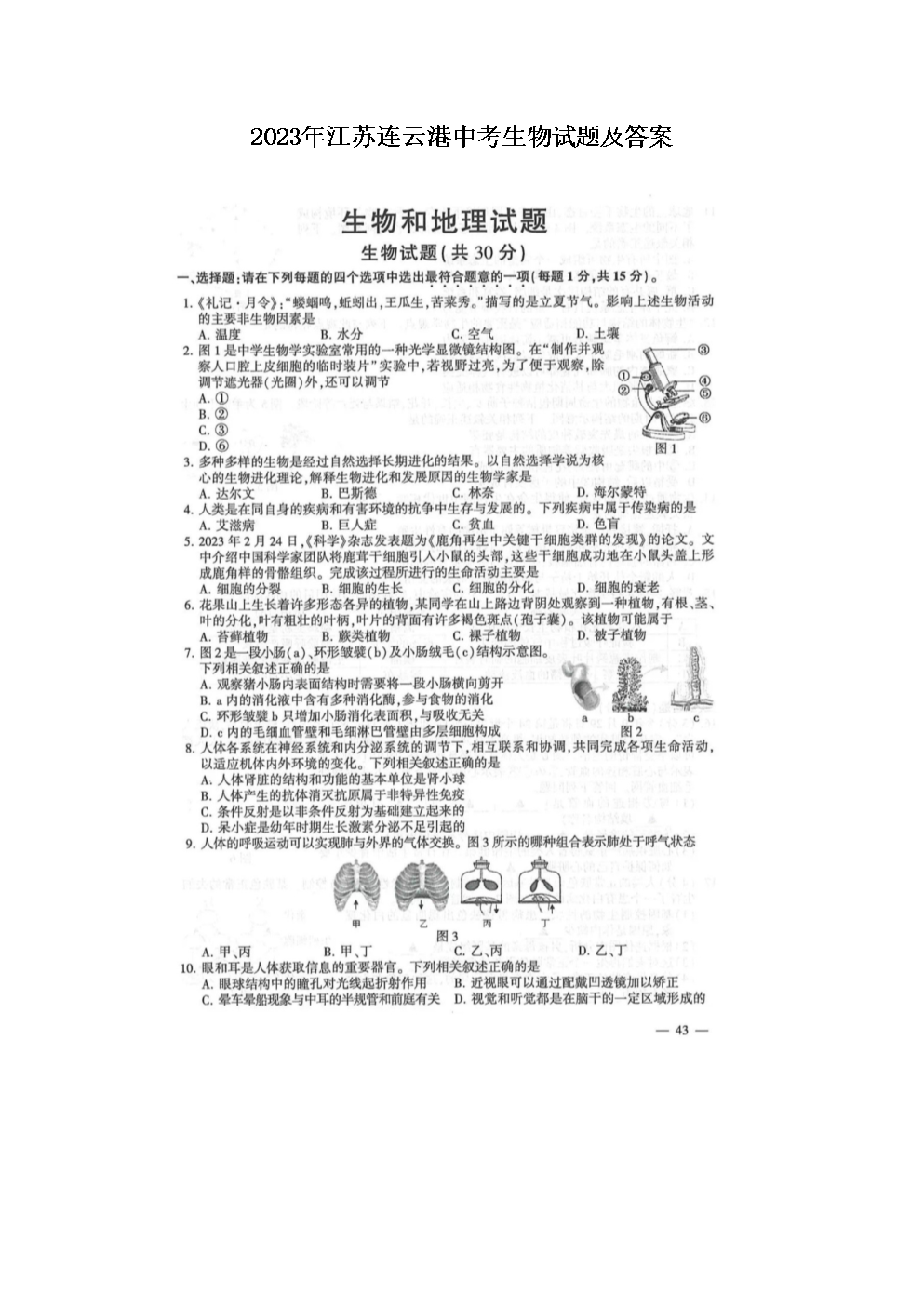 【文档名称】 2023年江苏连云港中考生物试题及答案(图片版).doc