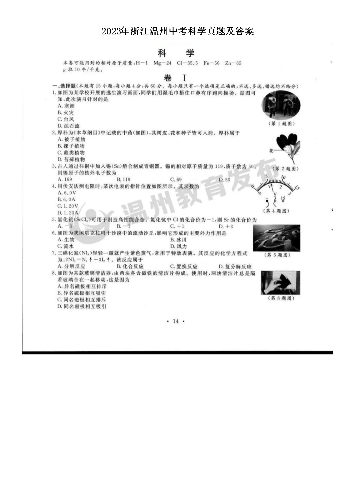 【文档预览】 无忧考网整理发布2023年浙江温州中考科学真题及答案(图片版),前五页预览如下: