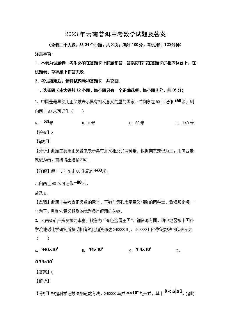【文档名称】 2023年云南普洱中考数学试题及答案(Word版).doc