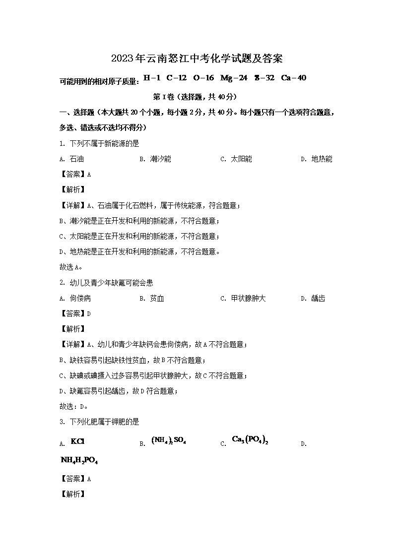 【文档名称】 2023年云南怒江中考化学试题及答案(Word版).doc