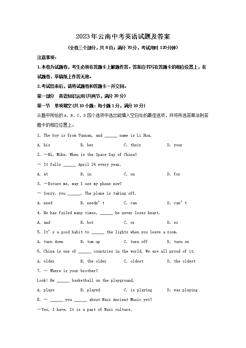 【文档名称】 2023年云南中考英语试题及答案(Word版).doc