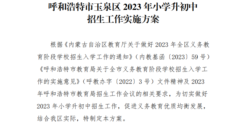 点击查看:呼和浩特市玉泉区2023年小学升初中招生工作实施方案.pdf(完整版)