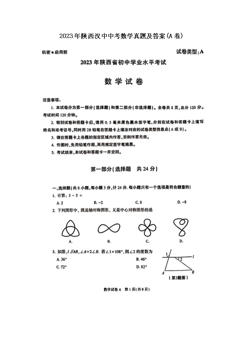 【文档名称】 2023年陕西汉中中考数学真题及答案(A卷)(图片版).doc
