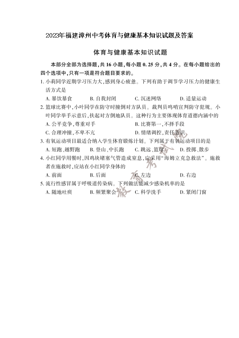 【文档名称】 2023年福建漳州中考体育与健康基本知识试题及答案(图片版).doc