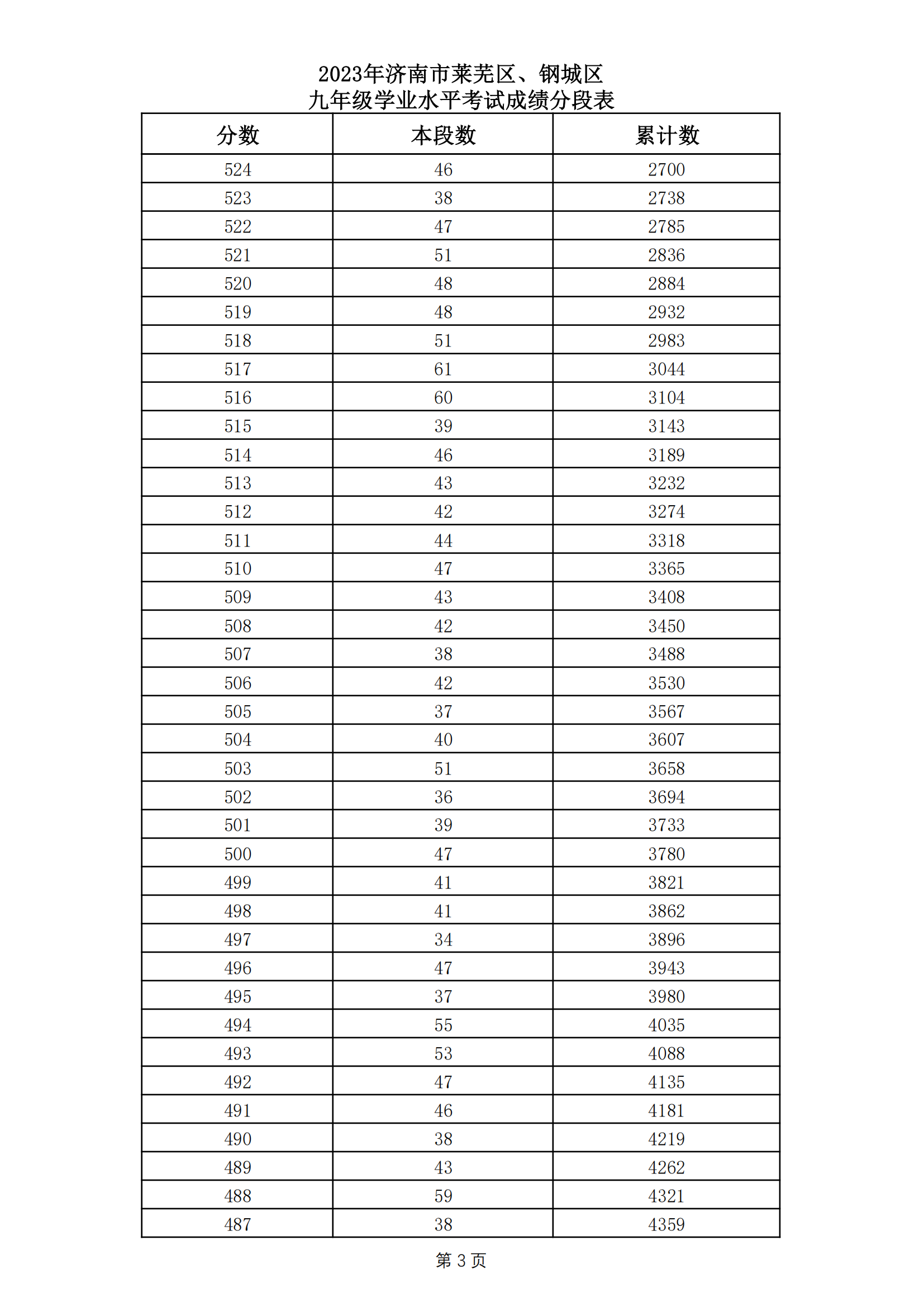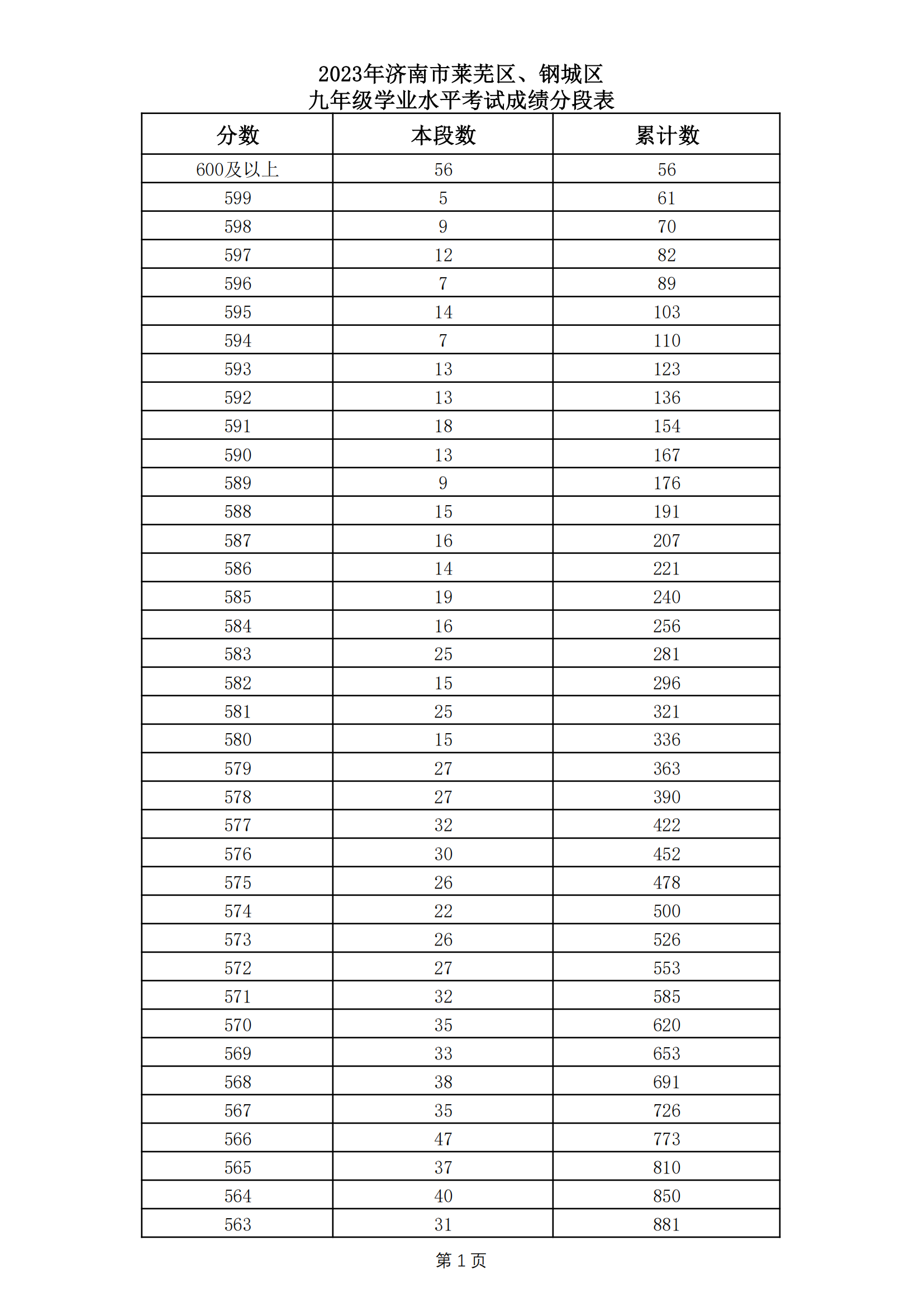 2023年山东济南九年级学业水平考试成绩分段表(莱芜区、钢城