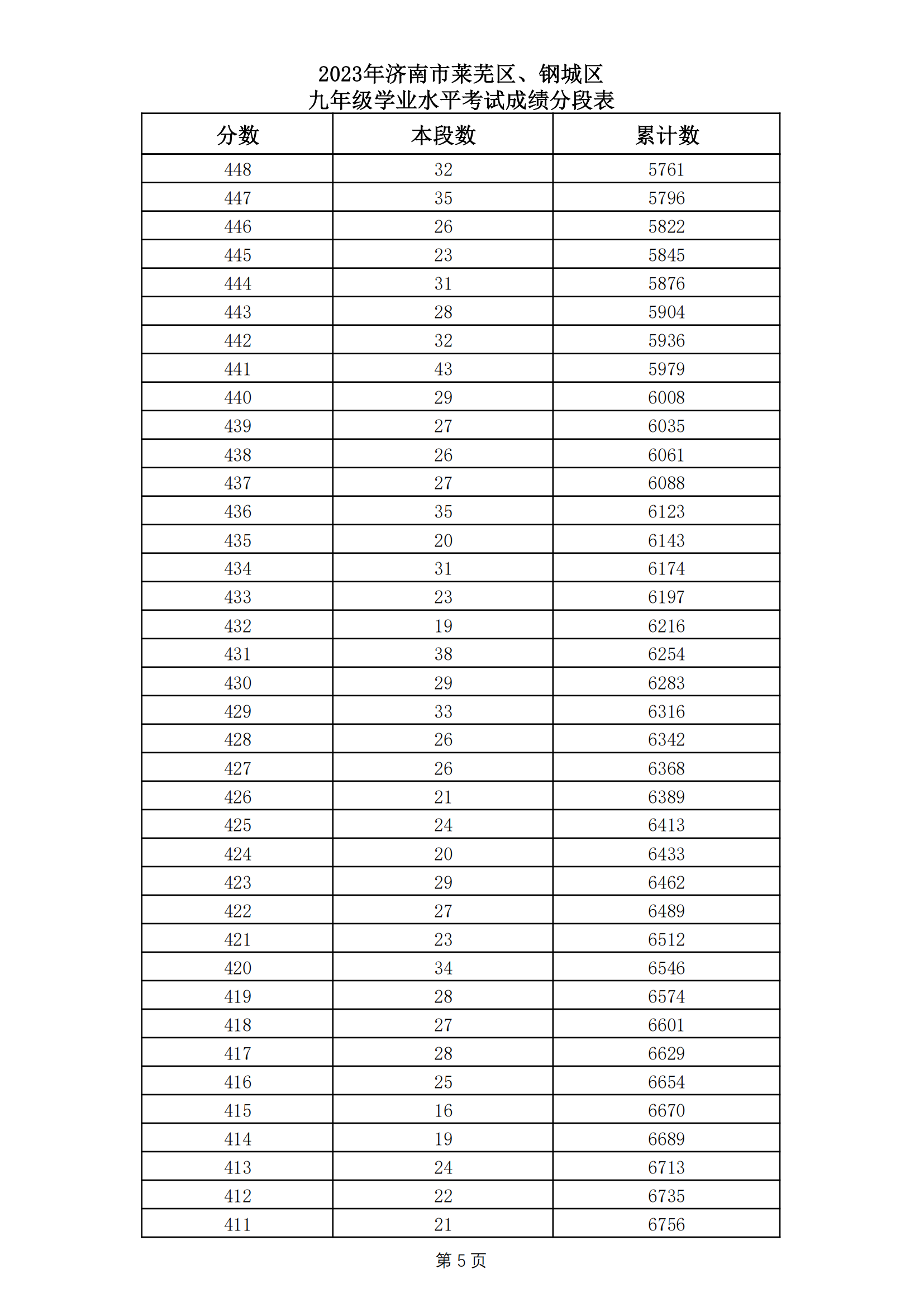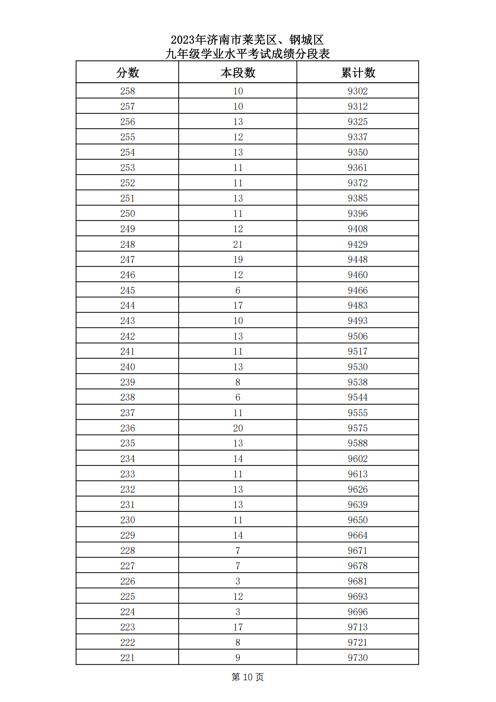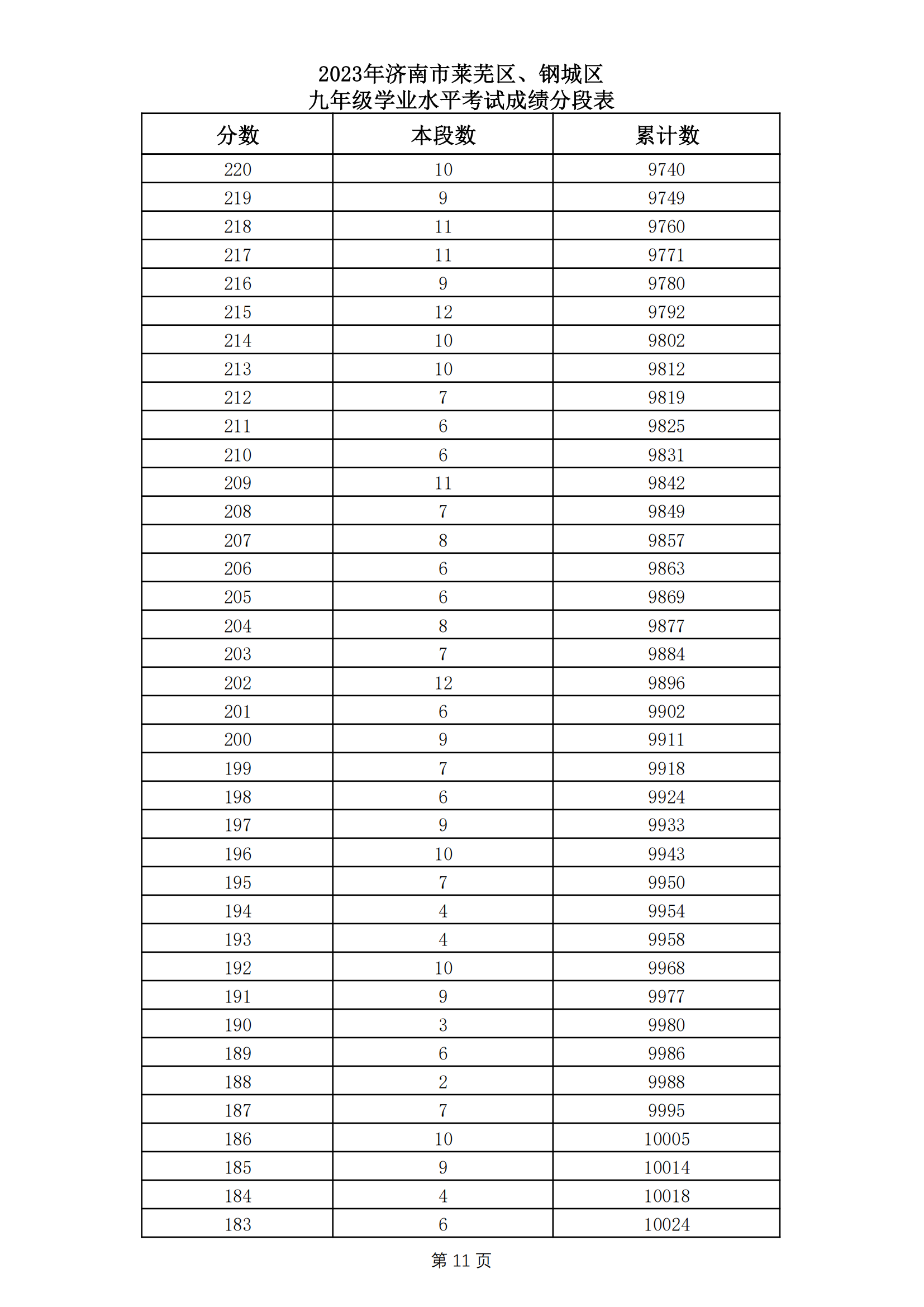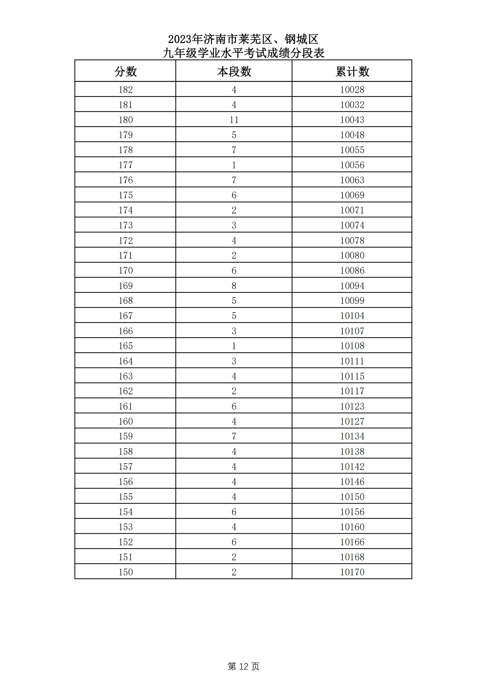 2023年山东济南九年级学业水平考试成绩分段表(莱芜区、钢城区)