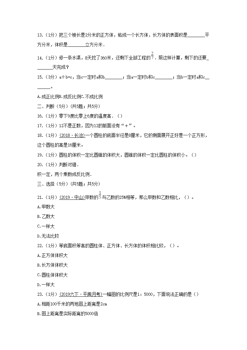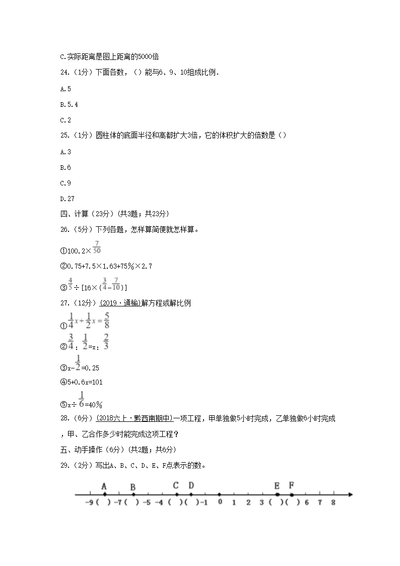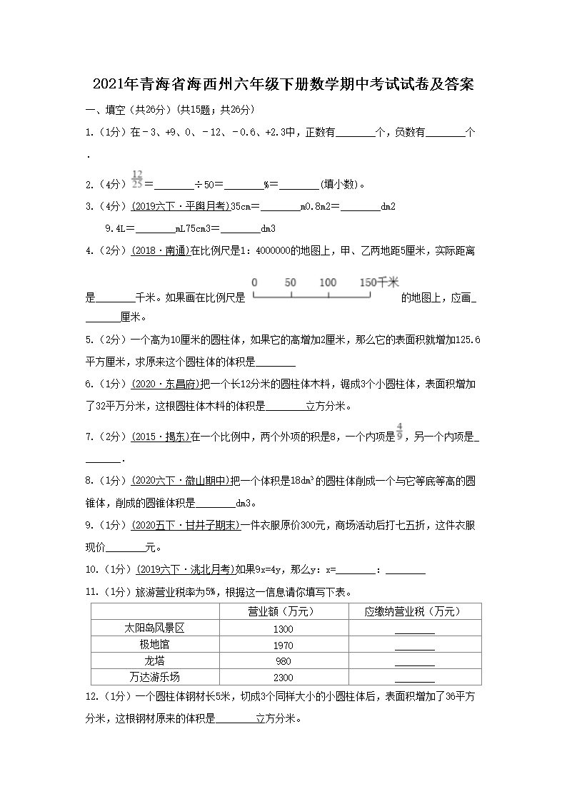 【文档名称】 2021年青海省海西州六年级下册数学期中考试试卷及答案(Word版).doc