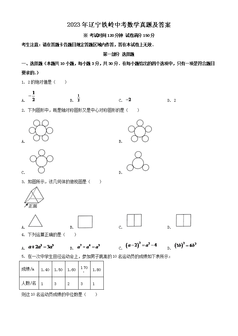 【文档名称】 2023年辽宁铁岭中考数学真题及答案(Word版).doc