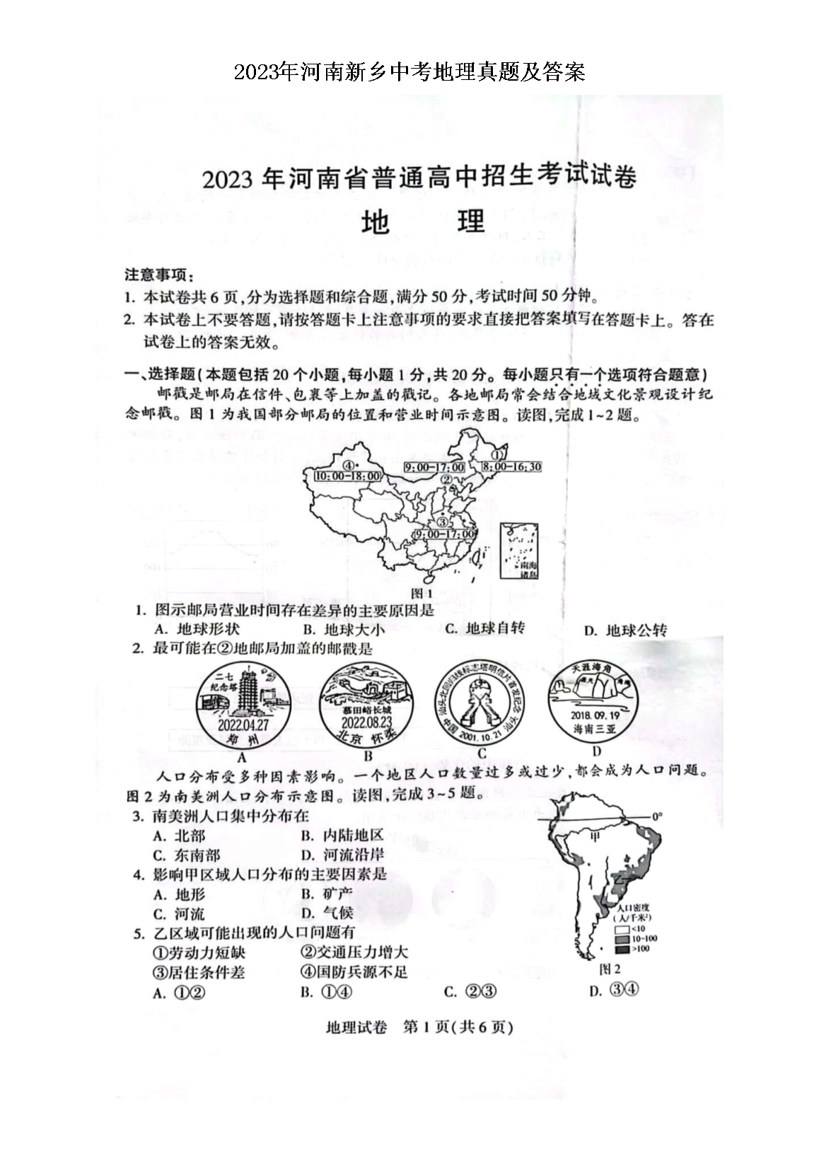 【文档名称】 2023年河南新乡中考地理真题及答案(图片版).doc