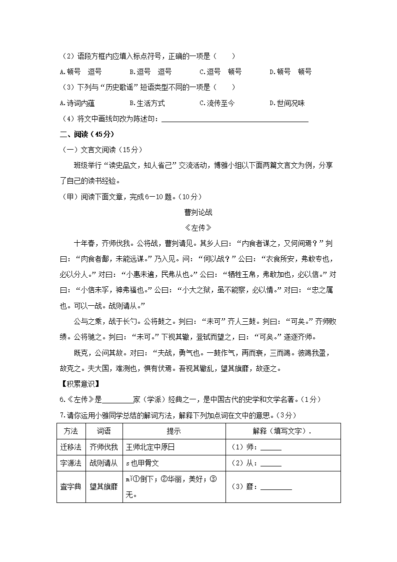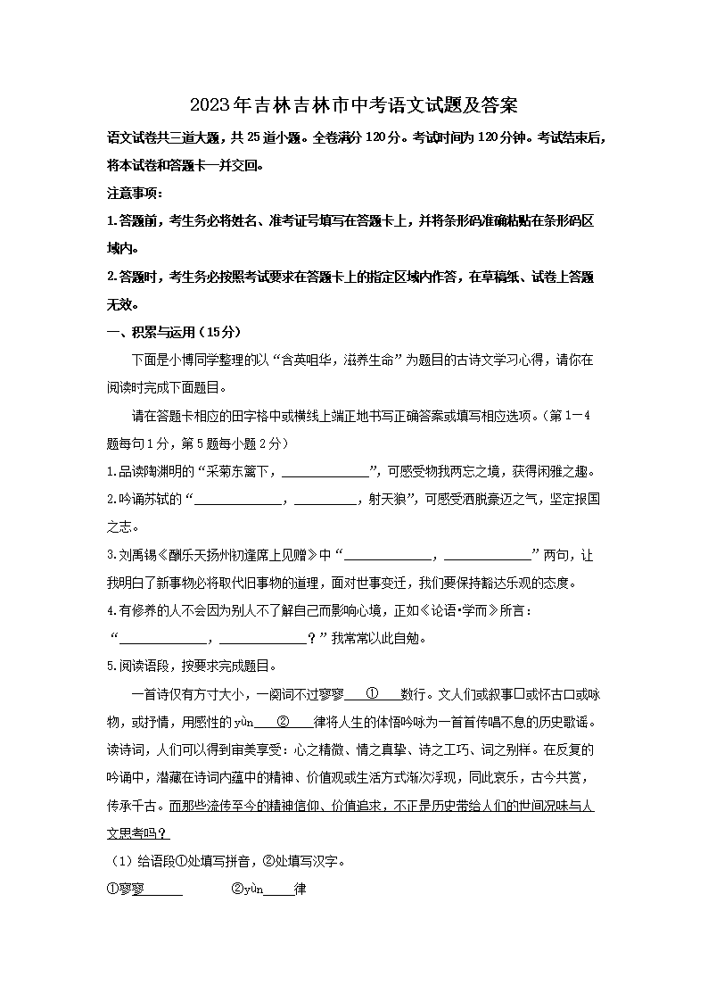 【文档名称】 2023年吉林吉林市中考语文试题及答案(Word版).doc