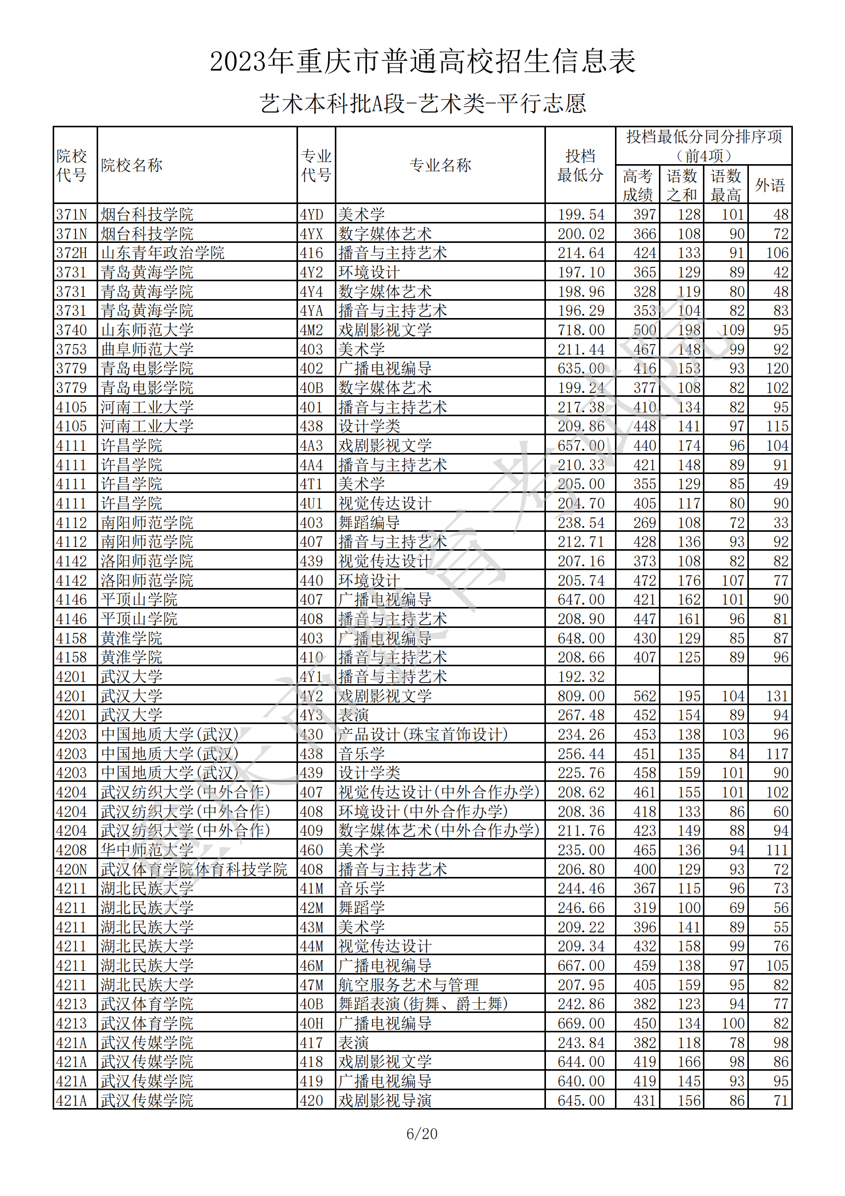 2023年重庆市普通高校招生信息表(艺术本科批A段-艺术类-平行志愿)