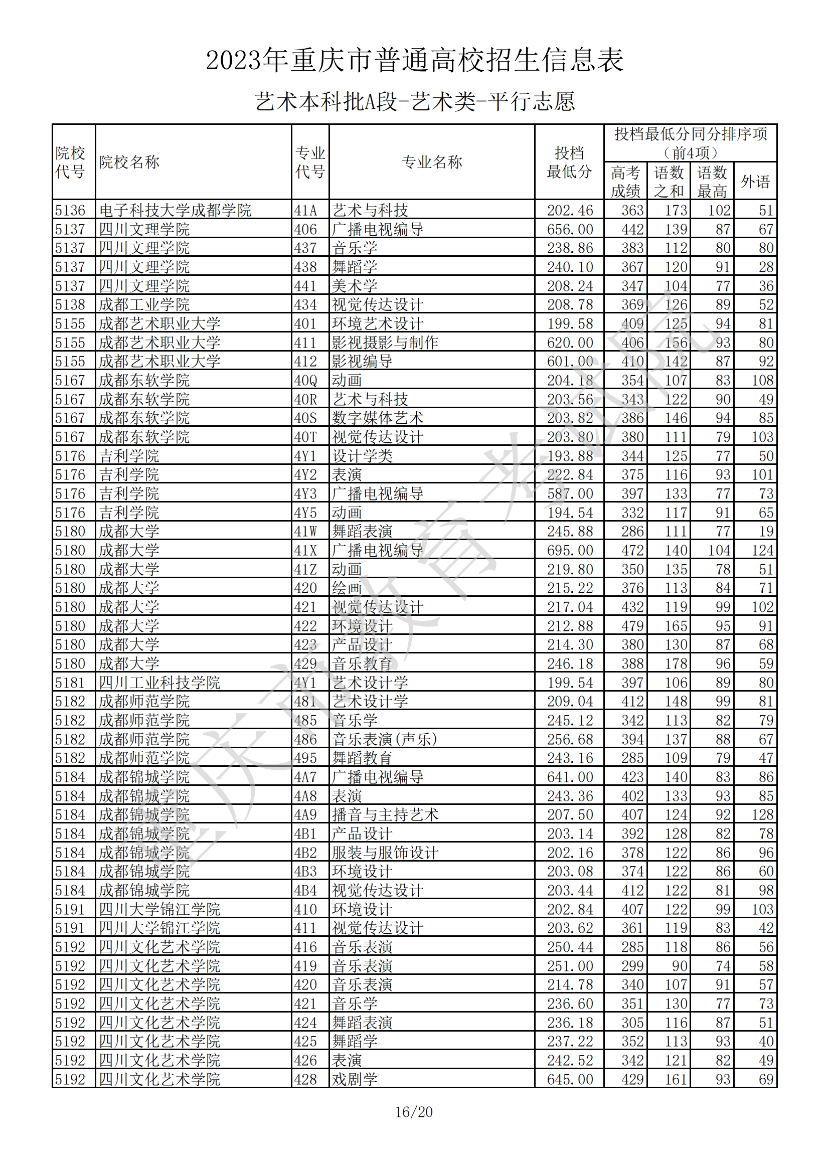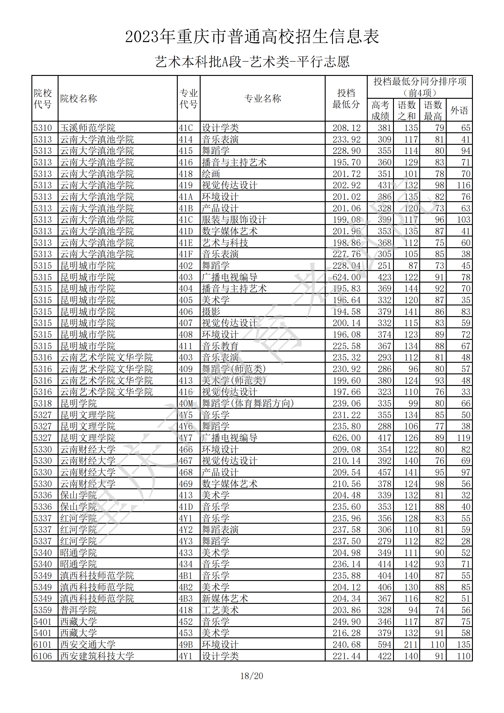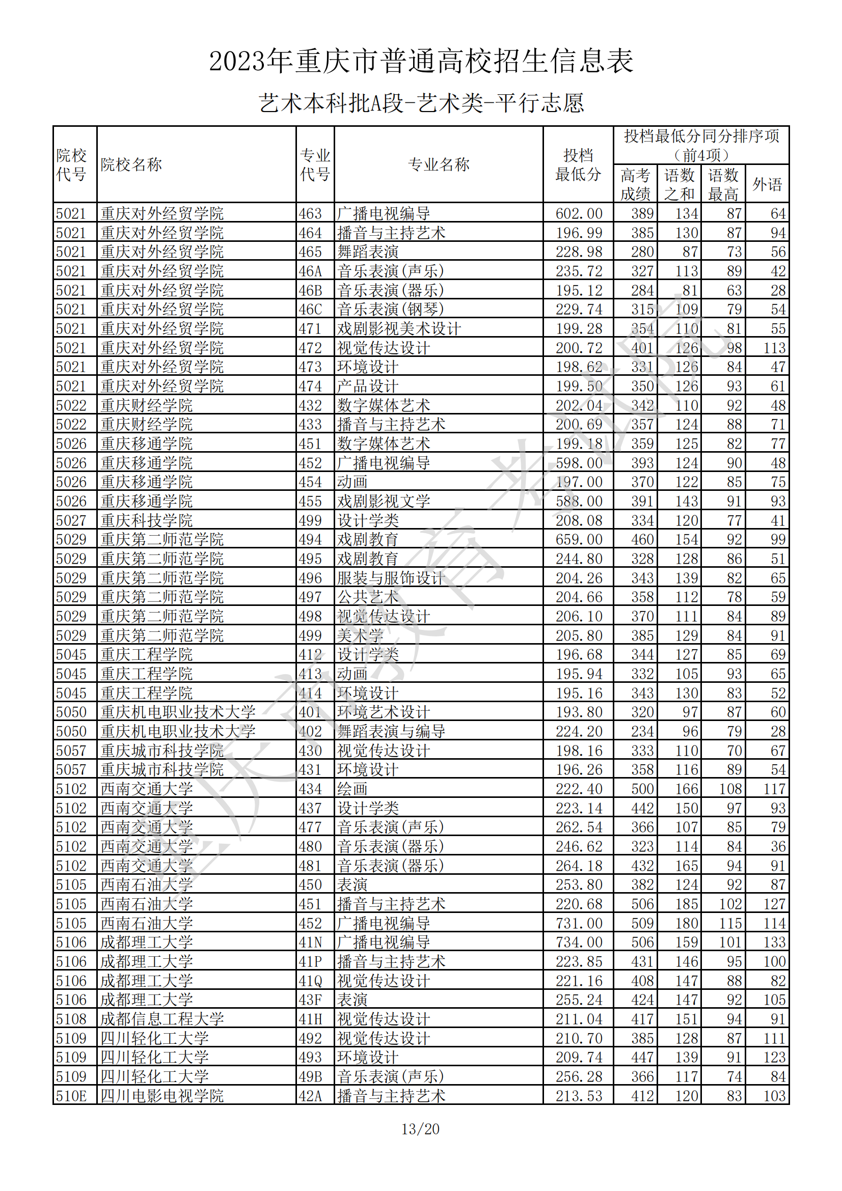 网从重庆市教育考试院了解到,2023年重庆市普通高校招生信息表(艺术本科批A段-艺术类-平行志愿)已公布,详细内容如下: