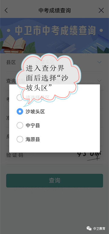 登录“我的宁夏”APP首页,点击页面下方“本地”栏目,进入中卫市界面;点击“中卫教育”专栏“中考成绩查询”,选择县区“沙坡头区”,输入考生姓名、准考证号、身份证号后六位和验证码,点击“查询”,即可查询成绩及录取学校。如无法通过线上查询的考生,可联系原学校帮助查询。