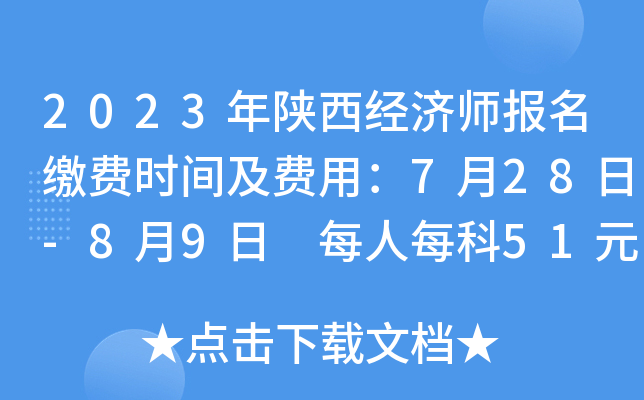 【#经济师考试# #2023年陕西经济师报名缴费时间及费用:7月28日-8月9日 每人每科51元#】©无忧考网小编根据陕西人事考试网发布“陕西省2023年度初级、中级经济专业技术资格考试考务工作的公告”得知,2023年陕西经济师报名缴费时间为7月28日至8月9日,每人每科收费51元。