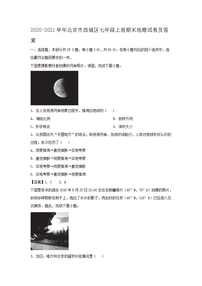 【文档名称】 2020-2021学年北京市西城区七年级上册期末地理试卷及答案(Word版).doc