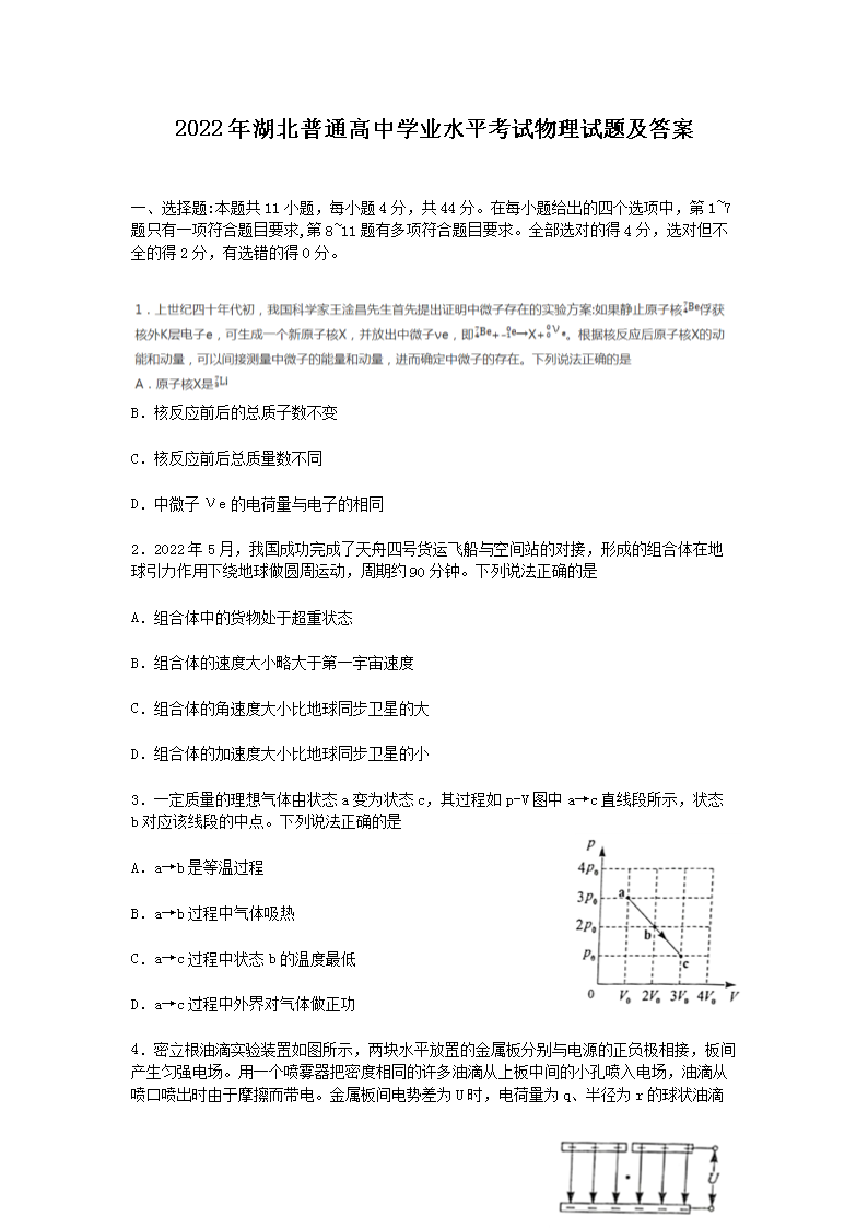 【文档预览】 无忧考网整理发布2022年湖北普通高中学业水平考试物理试题及答案(Word版),前五页预览如下: