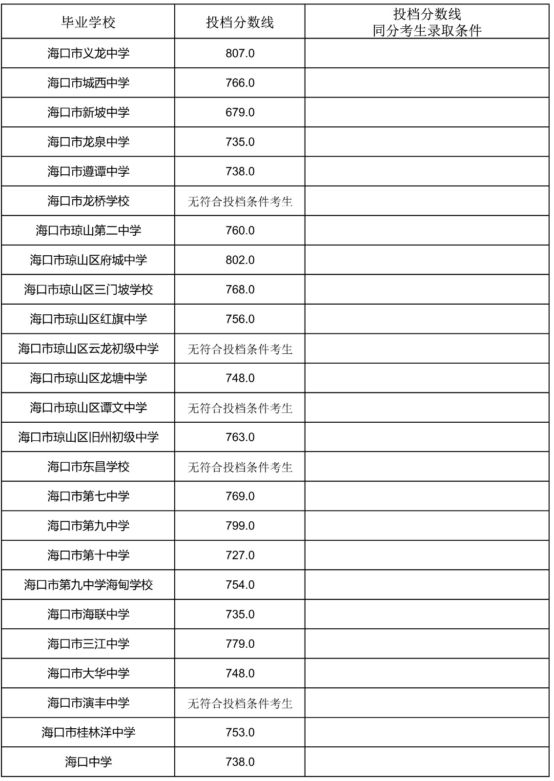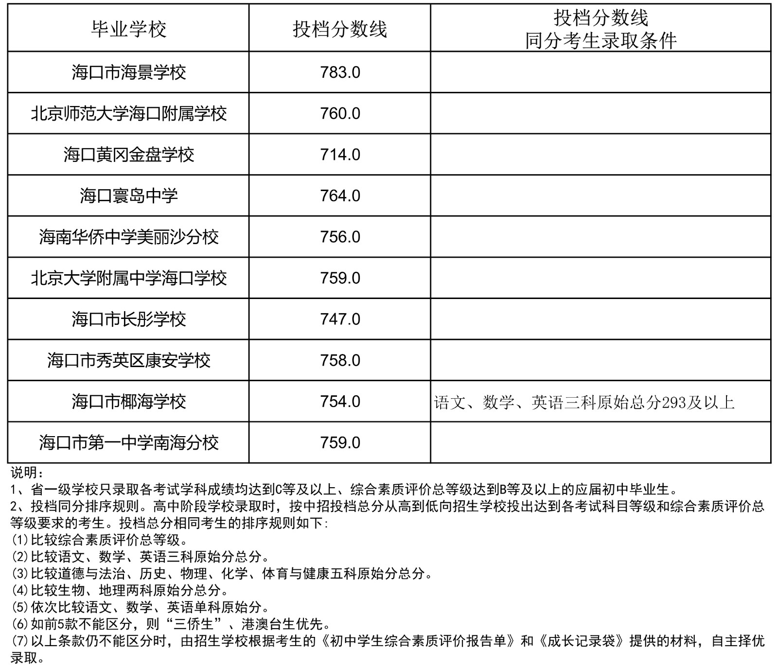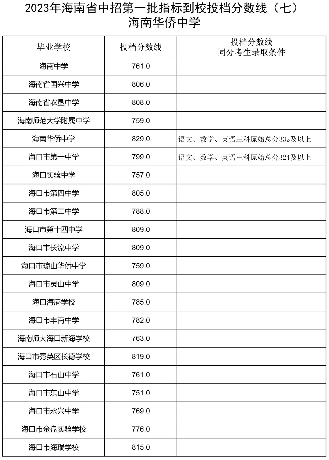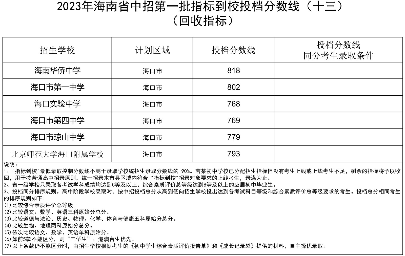 2023年海南省中招第一批指标到校投档分数线(7-13)