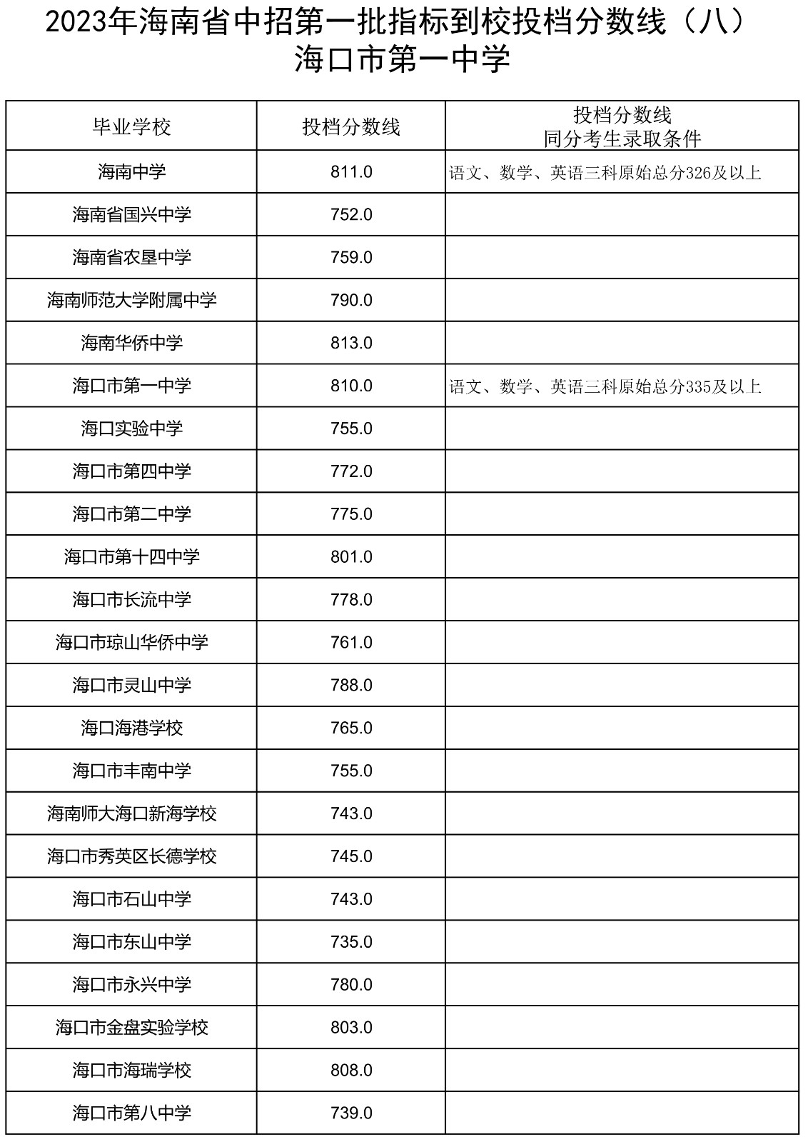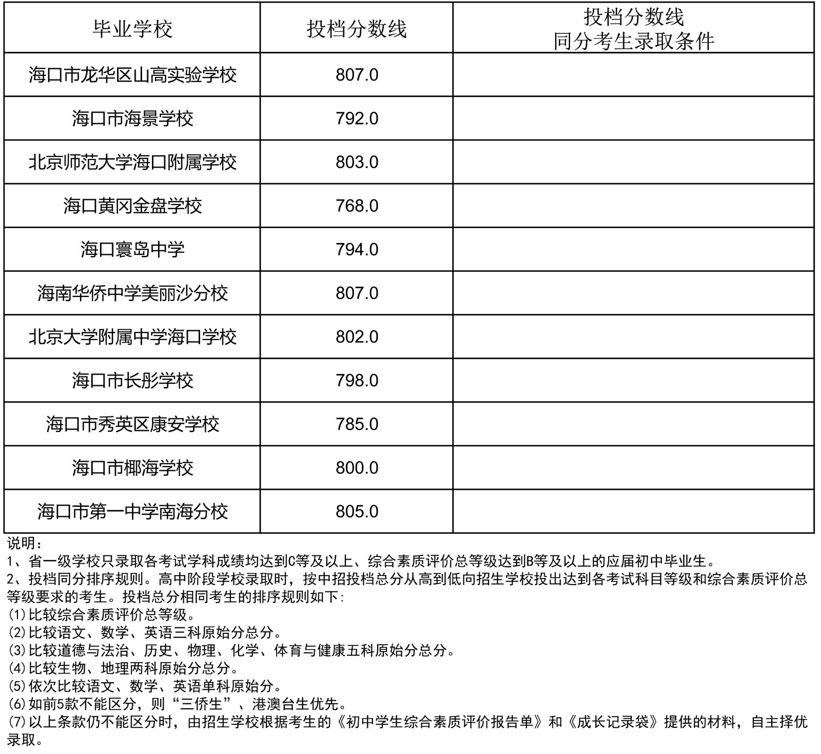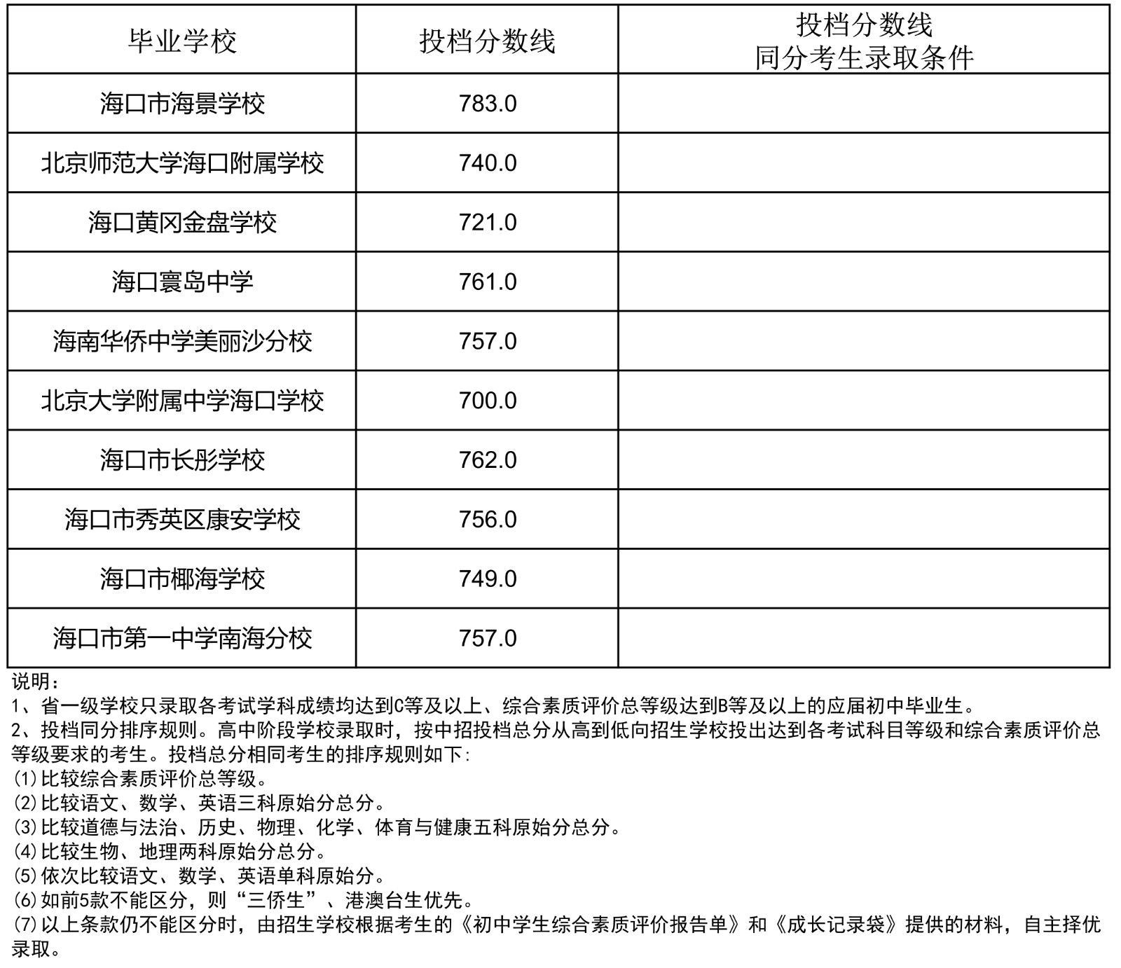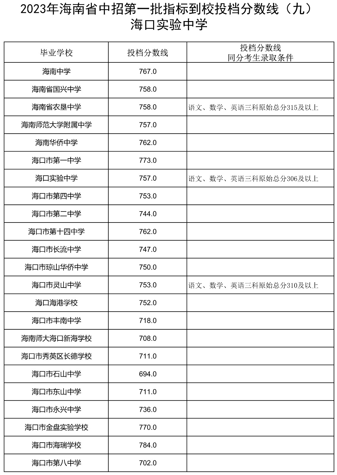 2023年海南省中招第一批指标到校投档分数线(7-13)