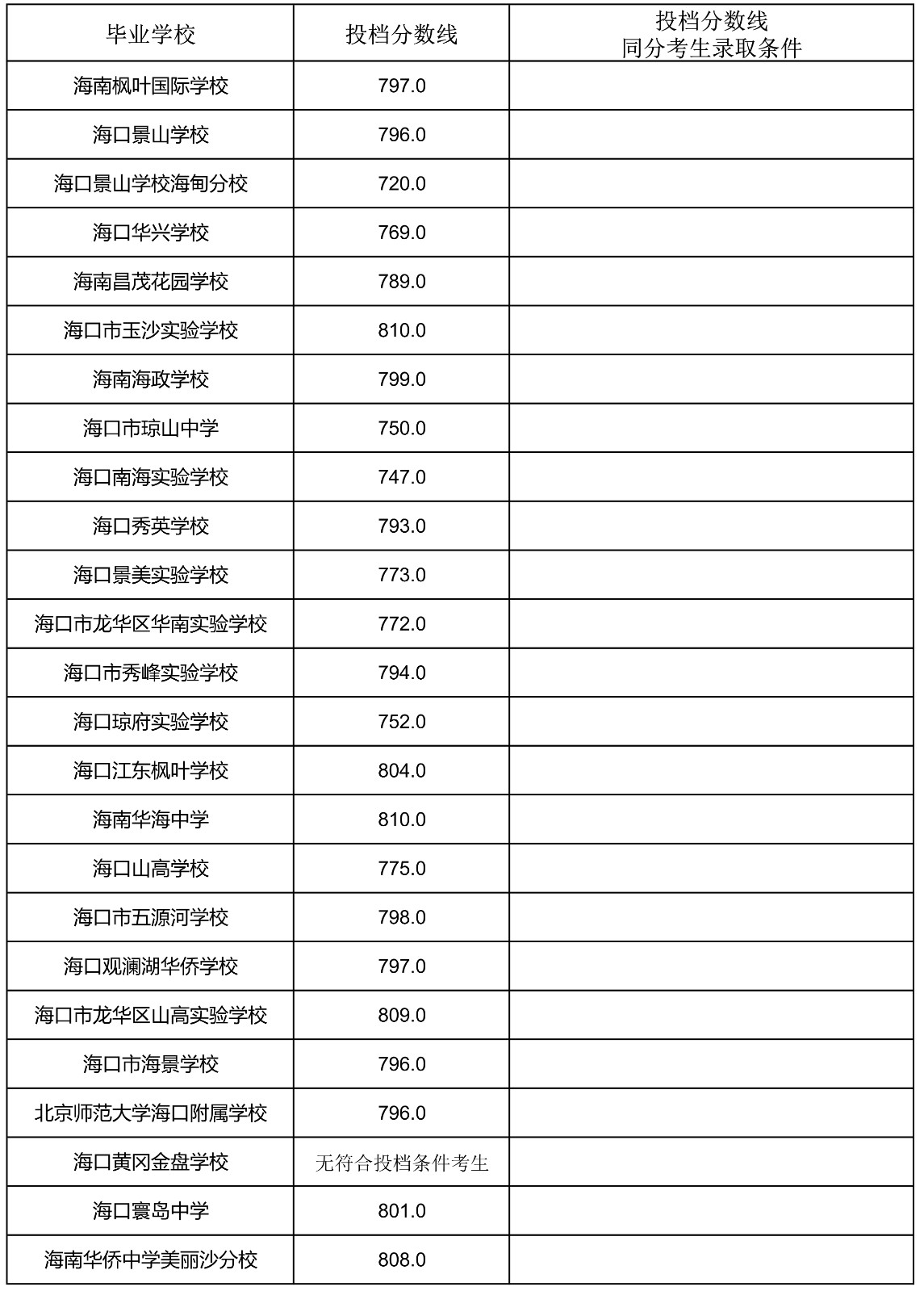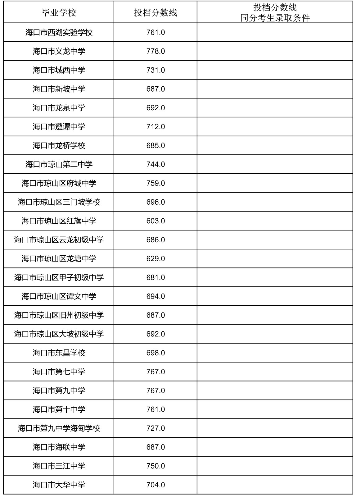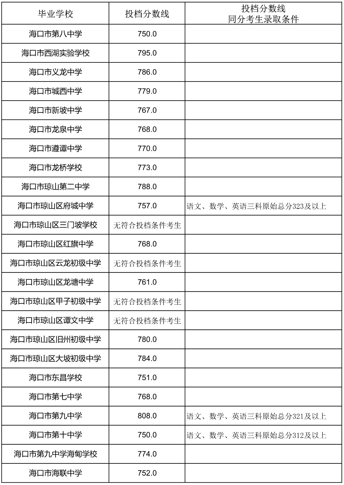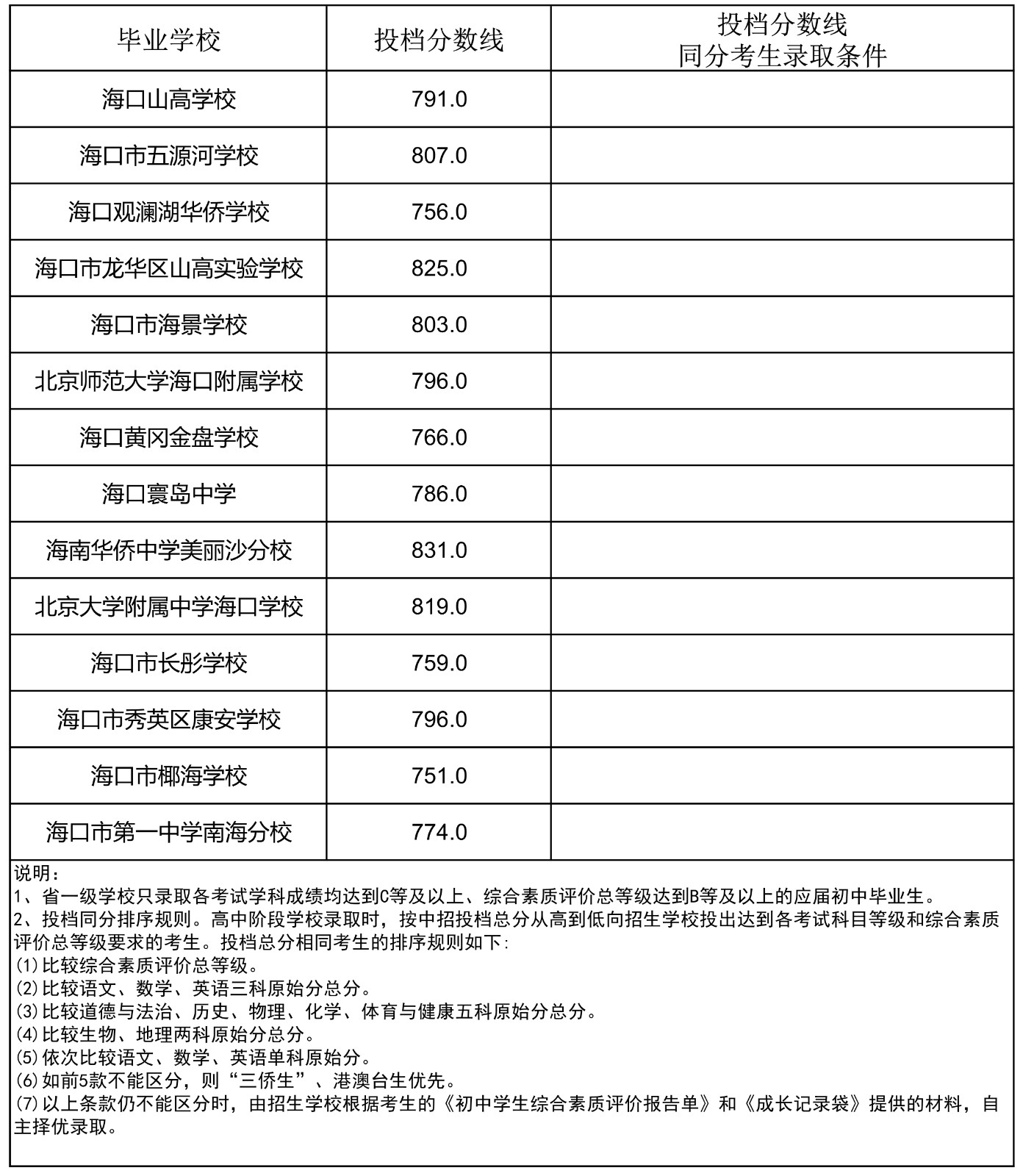 2023年海南省中招第一批指标到校投档分数线(7-13)
